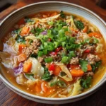 Delicious bowl of cozy one-pot egg roll soup with fresh vegetables