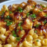 A comforting dish of creamy macaroni tossed with shredded chicken in honey BBQ sauce and melted cheese, perfect for a cozy meal.