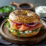 A delicious smoked salmon bagel topped with cream cheese, capers, and fresh dill, perfect for a cozy weekend brunch.